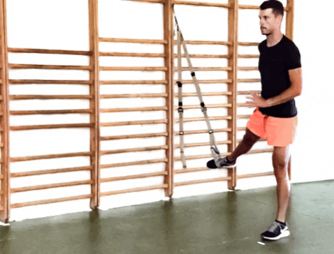 De profil, fléchis une jambe en maintenant le genou écarté et derrière la pointe de pied. Pousse simultanément l’autre jambe en flexion de cheville vers le point d’ancrage. Essaie de maintenir le tronc droit, et le bras opposé fixé devant.