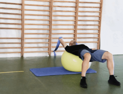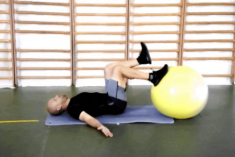 En couché dorsal, prends appui sur le ballon avec le talon pour soulever ton bassin vers le haut jusqu’à ressentir la contraction des fessiers. Ecarte les bras tendus au sol pour faciliter ton équilibre sur le ballon. Veille aussi à contrôler la descente sans ramener les fesses au sol.