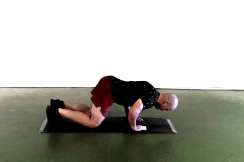 Effectue un saut en fin de poussée explosive. Amorti bien la chute en fléchissant les bras. Ce mouvement te permettras de relancer le second jump. Garde l’alignement tête-tronc-bassin et rentre ton nombril pendant l’exécution de l’exercice!
