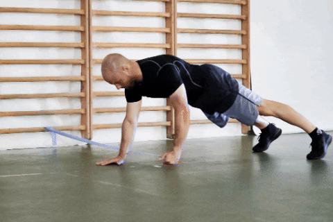 En gainage sur mains, attrape l’élastique et réalise un mouvement d’extension vers l’avant en le tirant devant la tête. Pense à fixer les omoplates en poussant la poitrine vers l’avant, maintiens le ventre rentré et fesses contractées. Les pieds sont écartés pour assurer ton équilibre. Pour plus de difficulté, éloigne-toi du point d’ancrage.