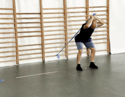 Attrape l’élastique à deux mains, fléchis légèrement les jambes en positionnant les fessiers à hauteur des talons. Garde la tête dans le prolongement du buste, et tends les bras de manière dynamique. Tout retour de l’élastique doit se faire de façon contrôlée en fléchissant les coudes, avant-bras fixés.