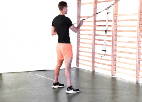 Appuis talons au sol, tirer avec un bras le long de la sangle, et contrôler la descente du bras avec ouverture vers le sol, regard qui suit ce bras. Fixer les omoplates en poussant la poitrine vers l’avant + garder l’alignement bassin-tronc. Pour plus de difficulté, se rapprocher du point d’ancrage.