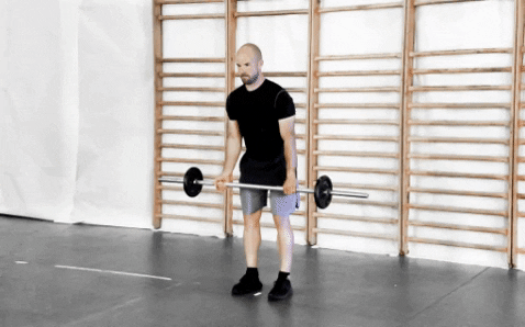 Sois vigilent sur la position des mains (une main renversée – une main prise classique). Le tirage se fait avec la barre collée au tibia et un avancement simultané du bassin. Le mouvement se termine avec une extension des hanches une fois debout.