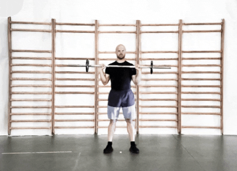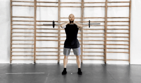 Réalise un front squat avec la barre maintenue sous la glotte. Appuis talons, engagement des fessiers vers l’arrière, genoux écartés.