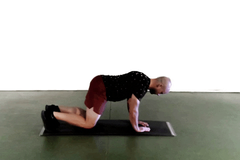 Flexion des coudes en gardant les coudes collés au corps, les mains rapprochées et les jambes semi-fléchies. Maintiens l’alignement tête-tronc-hanche durant tout l’exercice.